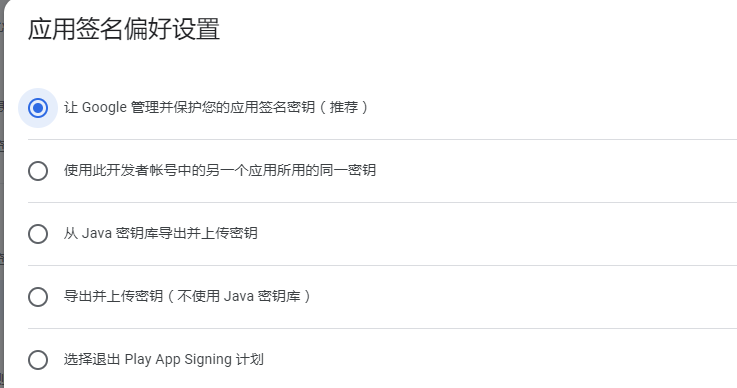 让Google管理并保护您的应用和签名密钥(推荐选项):若选择此选项,则aab使用VBP加固时不要勾选“签名校验”,否则Google会重新二次签名导致aab应用运行崩溃